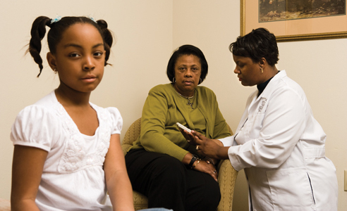 Dr. Dana Carthron with grandmother and grandchild. Dr. Carthron assesses the grandmother for diabetes.