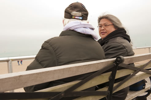(Above) Mr. Tiratira counseling an older adult client on the Boardwalk near Coney Island Hospital.