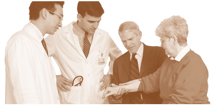 (Below) John R. Burton, MD, Director, Johns Hopkins Geriatric Education Center, providing guidance to primary care residents in the care of elder frail patients.