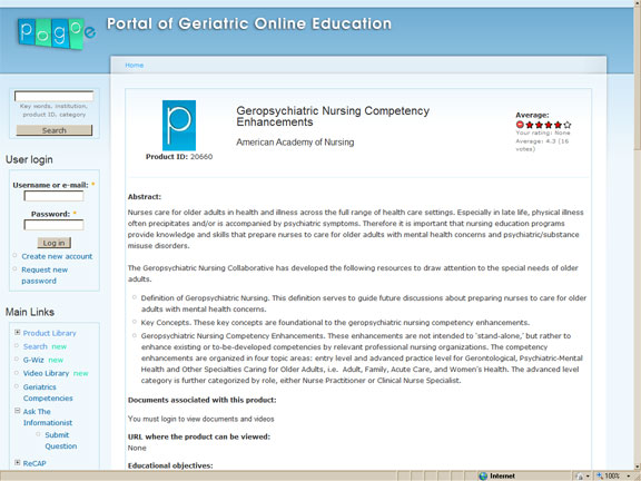 In 2004, the Donald W. Reynolds Foundation funded creation of POGOe (Portal of Online Geriatric Education), a free public repository of a growing collection of over 400 geriatric educational materials in various formats, including lectures, exercises, virtual patients, case-based discussions, simulations, and links to other resources. While traditionally a physician-focused resource, POGOe's mission is to promote geriatric education through the provision and encouragement of free exchange of teaching and assessment materials that support the fields of geriatrics and gerontology. Therefore, leaders of the Hartford Geriatric Nursing Initiative have recently partnered with the POGOe team at Mount Sinai School of Medicine and Vanderbilt University in order to disseminate Hartford’s geriatric nursing programs and products as widely as possible. Incorporation of these nursing resources is a logical next step in promoting POGOe as an interdisciplinary one-stop shop for gero curricular tools and resources.