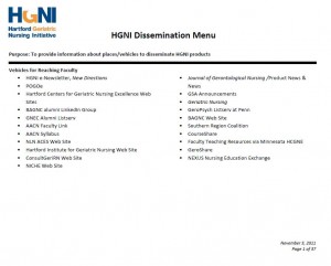 Here your gero nurse researcher will find a listing of Web sites, organizations, and other vehicles for promoting activities, products, and opportunities available from HGNI members. The 46-item Menu is conveniently organized by target audiences including vehicles to reach faculty, deans/directors/leaders, practitioners, and students.