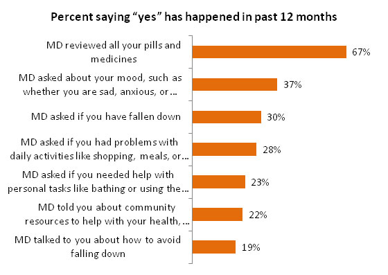 It turns out that the vast majority of older adults are at least somewhat satisfied with their care. But when you ask them specific questions about the care their doctors are providing, it becomes apparent that this satisfaction may be based on a lack of knowledge about what constitutes good care. We asked respondents about whether or not they had received seven recommended medical services that are typically part of a geriatric assessment (see below).