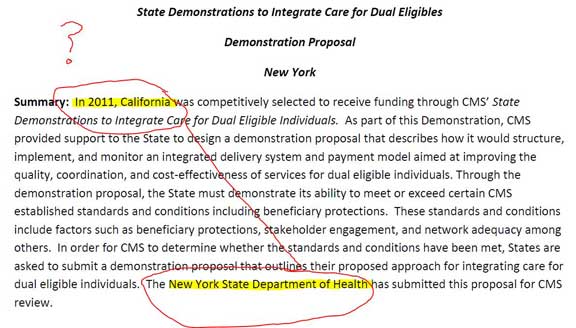 Nevertheless, the plans are very ambitious: Ohio wants to enroll in its "demonstration" some 114,000 of its 180,000 duals; California wants to enroll 685,000 of 1,100,000 duals in an eight-county region; and New York wants to enroll 250,000 of 755,000 duals. Ohio and California want to implement their plans by January 2013, while New York wants half by 2013 and the other half by 2014. I'm not sure we can realistically call these "demonstrations," especially as the states' plans already call for further expansion without any time to breath, evaluate, and revise the current approaches based on their results.