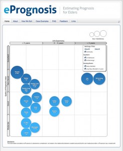 These caveats are important and this work is not without controversy and debate. In fact, I am as impressed with the dialogue fostered by the researchers around this issue as I am with the actual tool. The web site invites feedback via comments and incorporates user ratings on the usefulness of the prognostic indices. The web site tracks related conversations on Twitter and links to the always-informative GeriPal blog (co-founded by Widera and Smith), which has had a lively online debate about overall prognosis in the elderly and related issues around over- and under-utilization of health care services. Dr. Ken Covinsky, Lee’s colleague at UCSF, last week offered a thoughtful and cautionary post (Prognostic Indices In Patient Care: Useful or Waste of Time?), noting that prognostic indices can be of limited accuracy when applied to individuals. He doesn’t dismiss them, but states that like any other clinical tool, they need to be used intelligently.