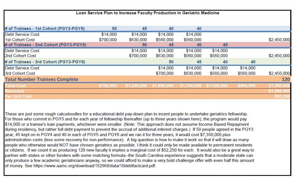 In the “debt service” approach as I imagine it, we run a competition to select residents as early as possible (PGY2) and offer to make their educational debt payments for them as long as they pursue academic geriatric training. Depending upon their debt level and interest rates, this would be around $10,000-$20,000 per year. Note we don't promise to pay off their loans, merely to make their payments for them in the particular years in which we want to influence behavior. In this approach, we take advantage of the time value of money and the relatively low income of resident physicians to influence their career choice at a critical moment. I’m not sure what markers might be used to predict success in academics at this stage of training, but given the availability of scholarly project time in residency, we could organize experiences that would quickly inform trainees and future fellowship directors/chiefs of the interests and capabilities of the awardees. Perhaps trainees who backed out early could incur minimal penalties to reduce their risks of trying, while we could impose repayment penalties for awardees who fail to follow through on their commitments after accepting more support.