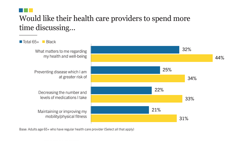 44% of Black older adults reported wanting their health care providers to spend more time discussing what matters to their health and well-being, compared to 32% of all older adults.
