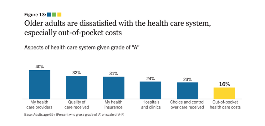 When asked to grade specific aspects of the health care system, out-of-pocket costs were rated the worst, with only 16% of older adults giving them an “A.”