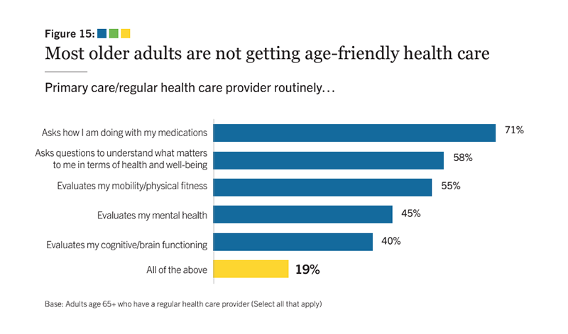 Only 19% of older adults surveyed say their health care provider routinely covers all the essentials of age-friendly care, represented by the 4Ms: what matters, medication, mentation and mobility.