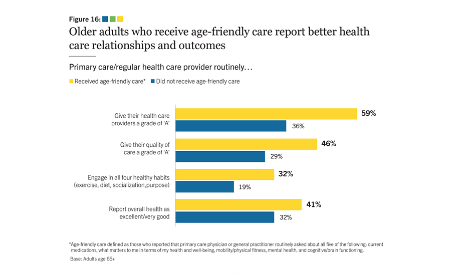 Compared to other older adults, those who receive age-friendly care give higher grades to their providers (59% vs 36%), and they report higher rates of excellent/very good health (41% to 32%).