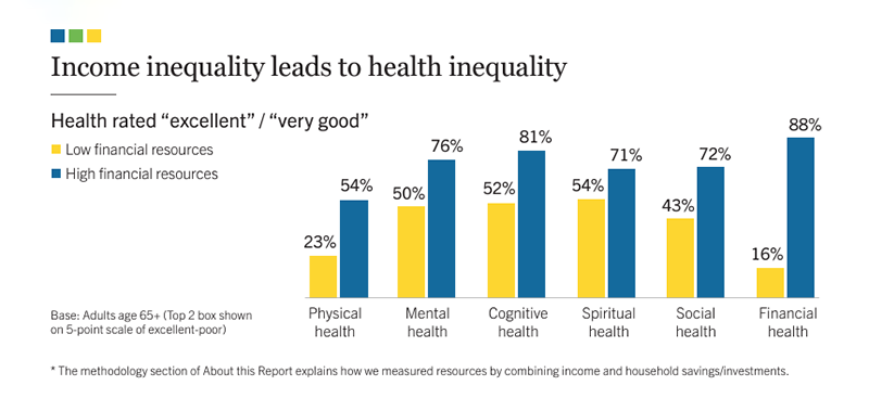 Only 23% of older adults with lower financial resources rate their physical health as excellent/very good, compared with 54% of older adults with higher financial resources.