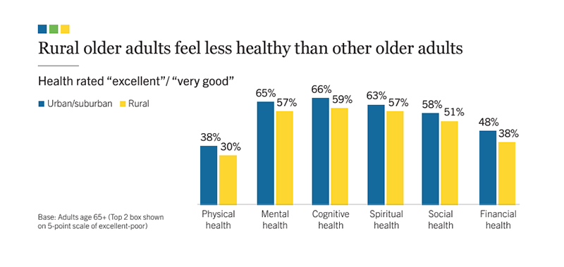 30% of rural older adults rate their physical health as excellent/very good, compared to 38% of urban/suburban older adults.